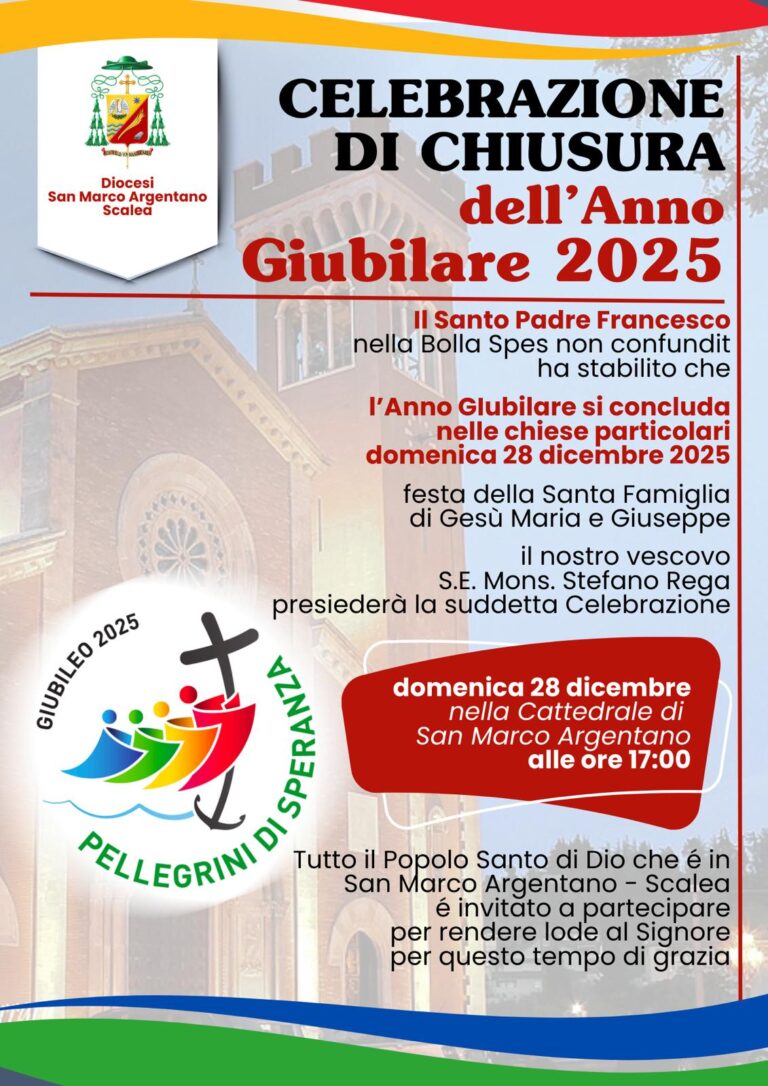 Domenica 28 dicembre, giorno in cui la Chiesa fa memoria della Santa Famiglia di Gesù, Maria e Giuseppe, la comunità diocesana di San Marco Argentano – Scalea  vivrà un momento particolarmente significativo con la conclusione dell’Anno Giubilare 2025, per ringraziare il Signore del cammino di grazia vissuto durante l’anno giubilare. La celebrazione sarà presieduta dal vescovo della diocesi, mons. Stefano Rega, che guiderà l’assemblea nella Cattedrale di San Marco Argentano a partire dalle ore 17. L’appuntamento rappresenta l’occasione per ritrovarsi come Popolo Santo di Dio, riconoscendo i doni ricevuti e rinnovando l’impegno per continuare a camminare come “pellegrini di speranza”, così come ha suggerito il tema del Giubileo 2025.
