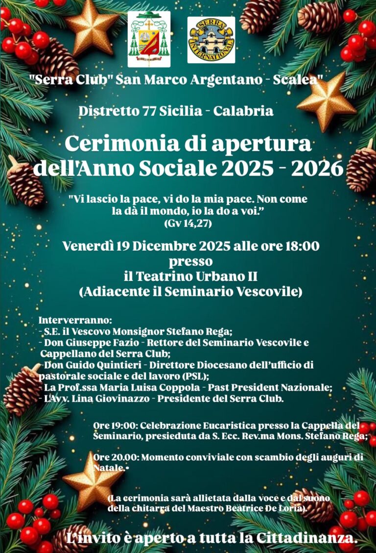 Venerdì 19 dicembre 2025, alle ore 18,00, il Serra Club di San Marco Argentano – Scalea, appartenente al Distretto 77 Sicilia – Calabria, inaugurerà l’Anno Sociale 2025-2026 con una solenne cerimonia presso il Teatrino Urbano II, adiacente al Seminario Vescovile.