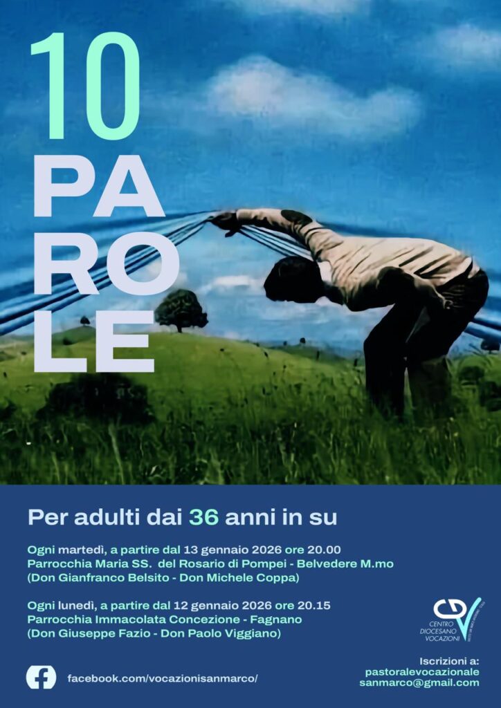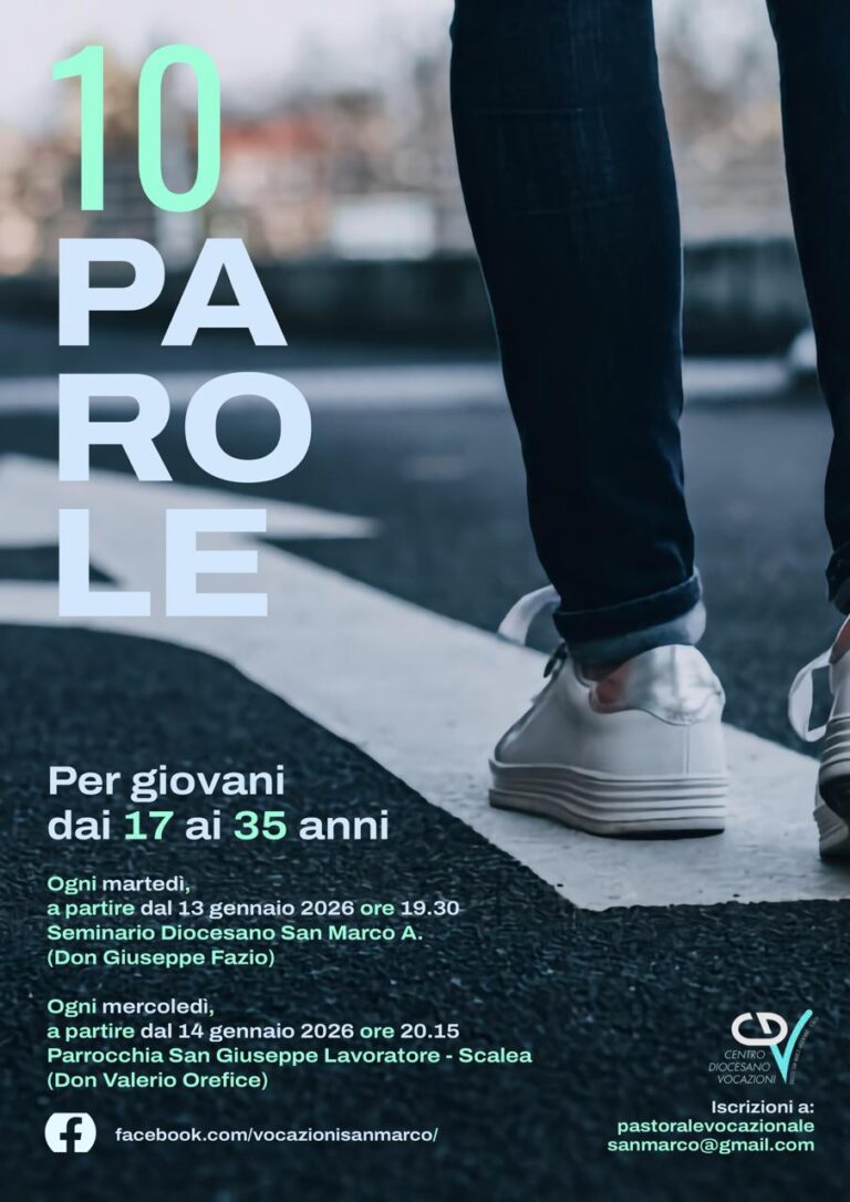 Nella vita di ogni credente ci sono momenti in cui le domande diventano più pressanti, i passaggi più delicati e il bisogno di una luce più chiara si fa sentire con maggiore intensità. Con questo spirito nasce il percorso delle Dieci Parole, proposto dal Centro Diocesano Vocazioni come occasione di crescita interiore e di rinnovata comprensione della propria chiamata. Due locandine presentano l’iniziativa, pensata in modo differenziato per giovani e adulti, ma unita dal medesimo desiderio di accompagnare ciascuno in un cammino di ascolto profondo della Parola di Dio.