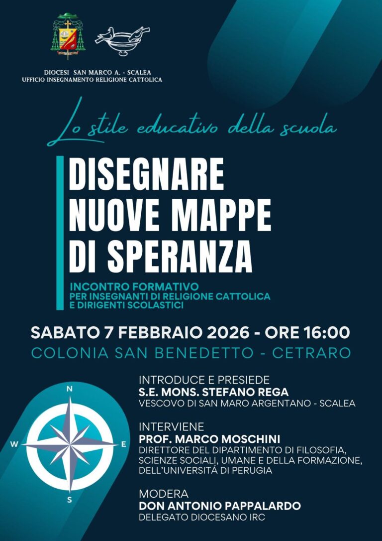 Accogliendo questa sfida, S.E. Mons. Stefano Rega, Vescovo della Diocesi, promuove l’incontro annuale di formazione dal titolo “Disegnare nuove mappe di speranza”, che si terrà sabato 7 febbraio 2026, alle ore 16.00, presso la Colonia San Benedetto di Cetraro.