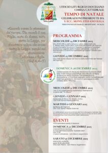 Le celebrazioni prenderanno avvio nella sera del 24 dicembre, quando alle ore 23.00 l’Ufficio delle letture con il canto della Kalenda introdurrà la celebrazione della Santa Messa nella Notte della solennità del Natale del Signore. Al termine della liturgia eucaristica, il vescovo si porterà al presepe allestito sul sagrato della Cattedrale per deporre il Bambinello e rivolgere gli auguri natalizi ai presenti.