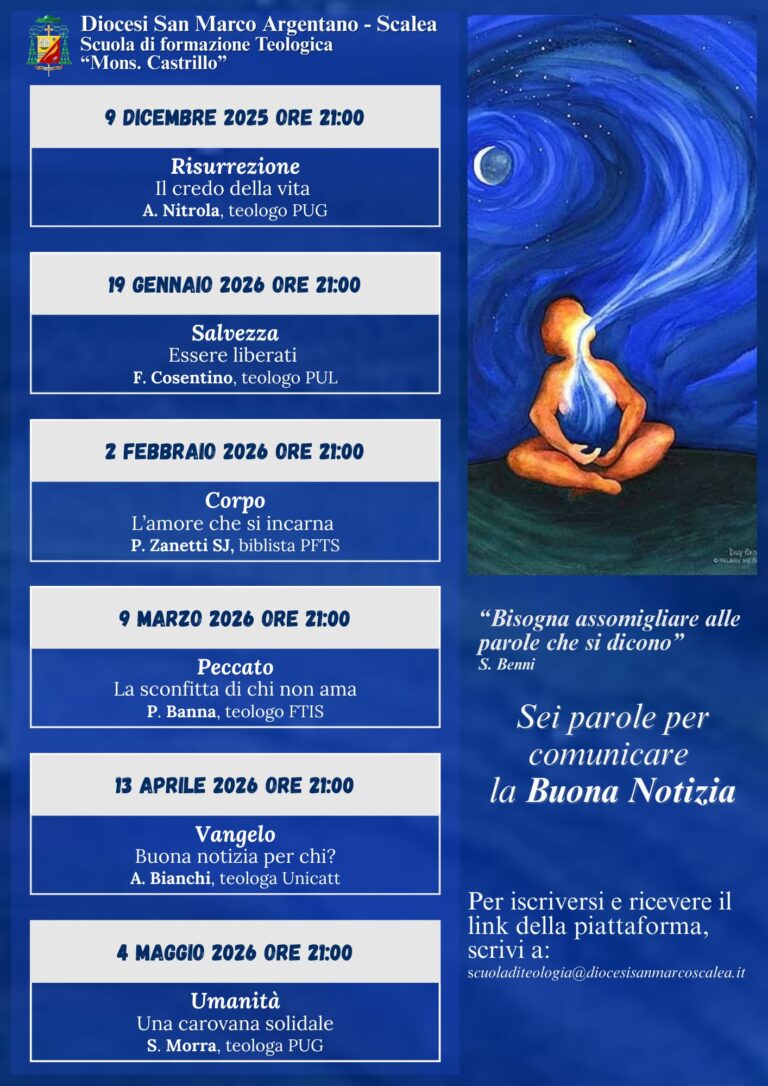 La Scuola di formazione teologica “Mons. Castrillo” della diocesi di San Marco Argentano-Scalea propone un nuovo itinerario di approfondimento dal titolo “Sei parole per comunicare la Buona Notizia”. Un percorso pensato per accompagnare credenti e operatori pastorali nella riscoperta del linguaggio della fede, alla luce delle verità fondamentali del Vangelo e dell’esperienza cristiana.