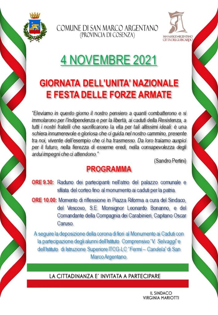 Giovedì 4 novembre alle ore 10 il Vescovo prende parte in Piazza Riforma a San Marco Argentano Giornata dell’Unità Nazionale e Festa delle Forze Armate insieme al Sindaco al Comandante della Compagnia dei Carabinieri, Capitano Oscar Caruso.